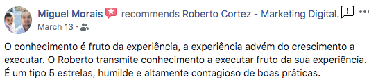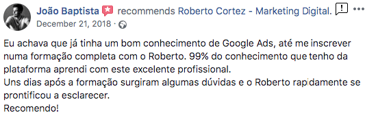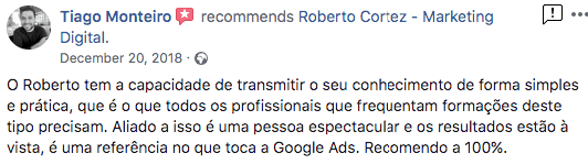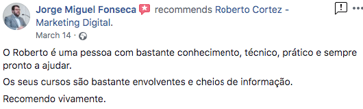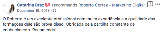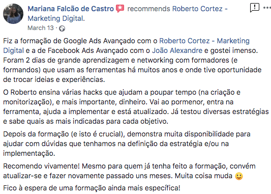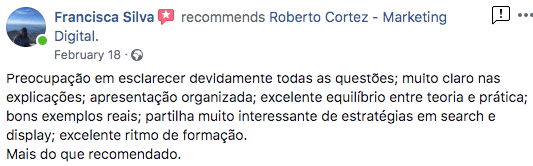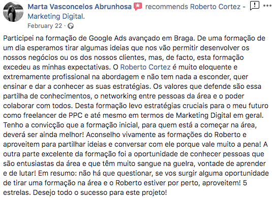 Ao longo dos últimos anos, dei formação a mais de 500 alunos. Encontrarás testemunhos valiosos na minha página do Facebook e nas recomendações do LinkedIn. Deixo-te alguns abaixo.